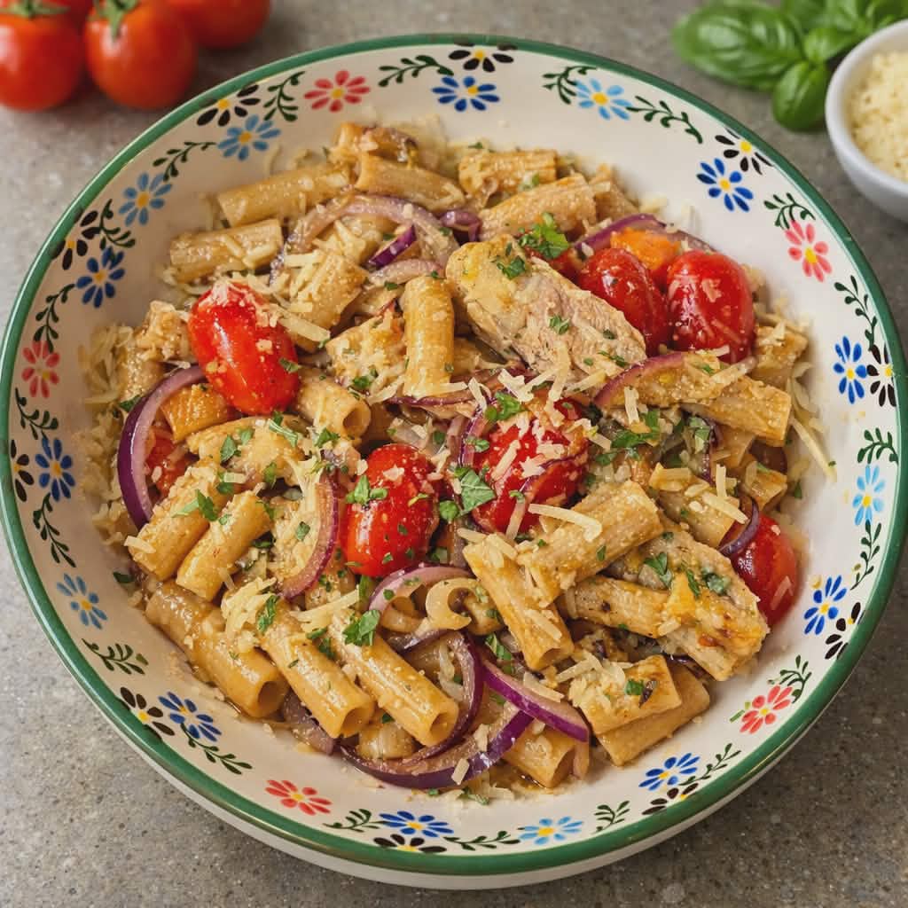 Keywords: Mediterranean pasta, Balsamic chicken pasta, Brown rice pasta, Fatty-liver friendly recipe, Liver-friendly dinner, Healthy pasta recipe, Grilled chicken pasta, Tomato basil pasta, Olive oil pasta, Gluten-free pasta meal, High fibre dinner, Heart-healthy recipe, Anti-inflammatory meal, Clean eating dinner, Weeknight Mediterranean,